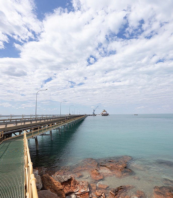 The Kimberley Marine Support Base consortium engaged TAMS Group to design and construct a new floating wharf and approach causeway. The contract demanded more than delivery of infrastructure, it required collaborative problem-solving, innovative engineering, and respect for environmental and cultural requirements. The scope included a 165-metre by 50-metre floating wharf positioned in naturally deep water, a 300-metre trestle causeway, link-span ramp and integration of essential services such as power, water, firefighting, and navigation systems.